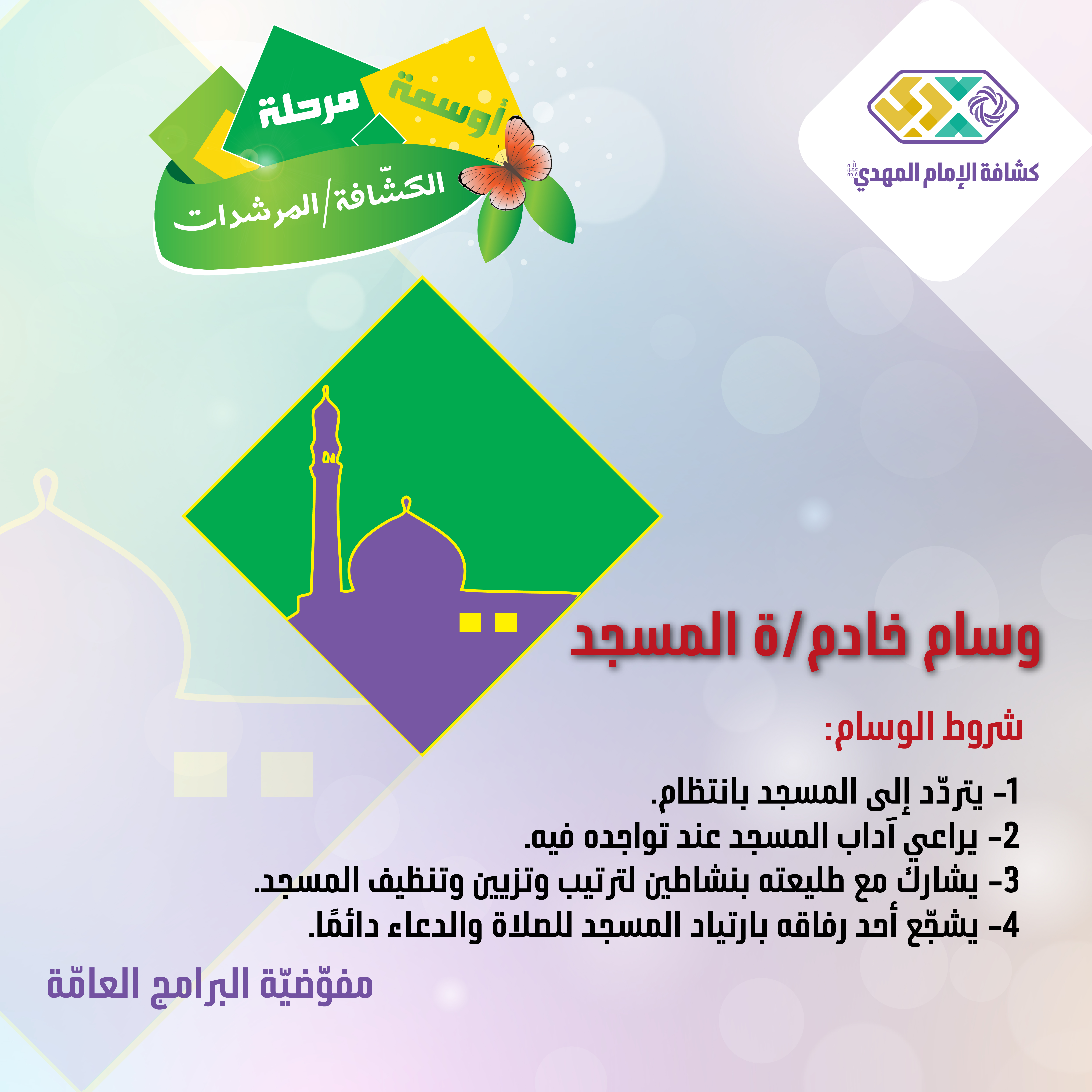 - يعرض القائد مطالب نَيْل وسام خادم/ة المسجد، ويشجّع المشاركين على تحقيقها. - ثمّ يرسل صورة الوسام على مجموعة الواتساب بعد انتهاء النشاط الحضوري.