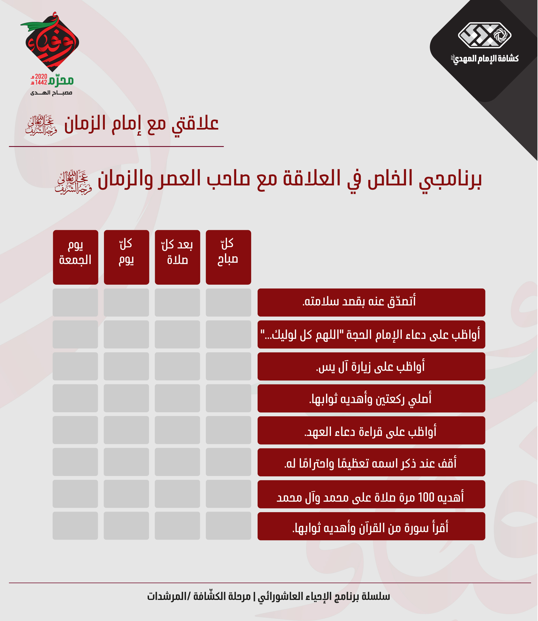 - يُختتم النشاط بدعاء الإمام الحجّة (عجّل الله فرجه).
