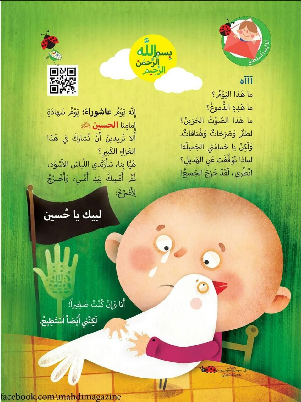 كتبَ مُجتبى البالِغ من العُمر ثماني سنوات في دفتر يوميّاتِه: اليوم حَصَلَت معي حادِثةً توقّفْتُ عندها كثيرًا. عندَ الظهيرة انطلقتُ إلى المجالس العاشورائيّة بعد أن ألبستني أمّي ثوبي الأسود، وحملتُ رايتي الجميلة، ووضعتُ عصبَةَ الرأسِ التي تحملُ شعار الإمام "أبا عبد الله" والتي كنتُ دومًا أتأمّلُها، فإمامي كانَ يحبُّ الله كثيرًا ويذكرُهُ في كلّ عملٍ يقوم به، وكلما انطلقَ في رحلة فبدأتُ بذكرِ "بسم الله" وحمدِهِ على نعمة الإمام الحسين وعاشوراء.