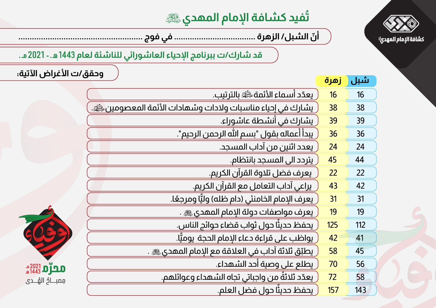 - ويعلن أيضًا عن أسماء المشاركين الذي حققوا أغراضًا في سجل التقدّم خلال الإحياء العاشورائي، مثال: