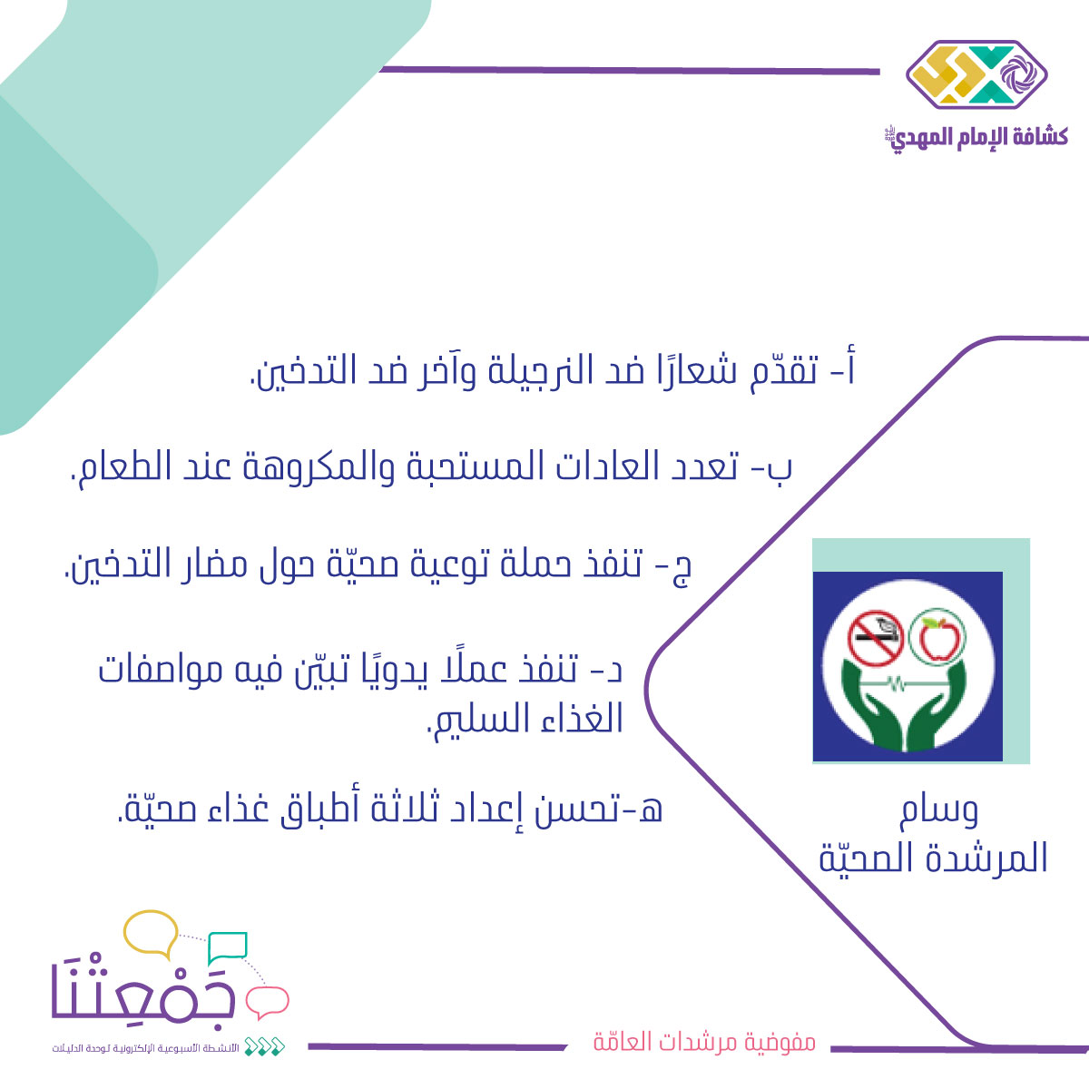 المطلب رقم 116 (تشرح مواصفات الغذاء السليم)مطالب وسام المرشدة الصحية: تعدد العادات المستحبة والمكروهة عند تناول الطعام .تنفذ عملًا فنيًّا تبين فيه مواصفات الغذاء السليم. |