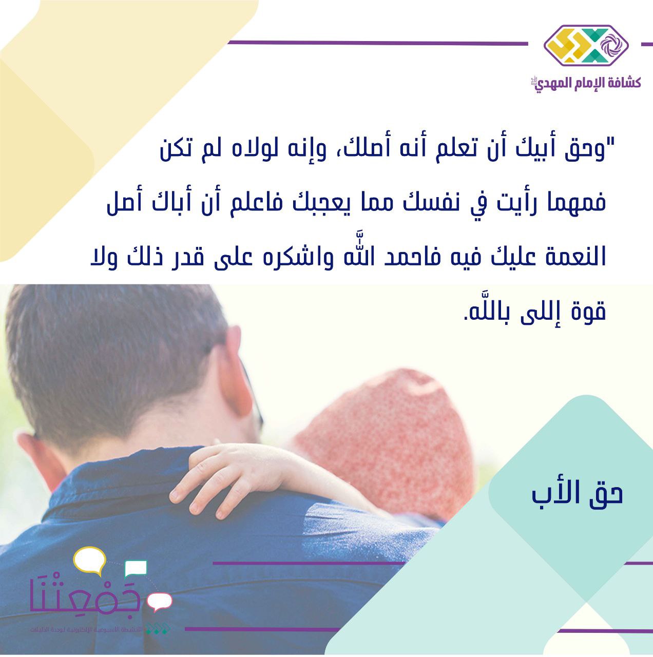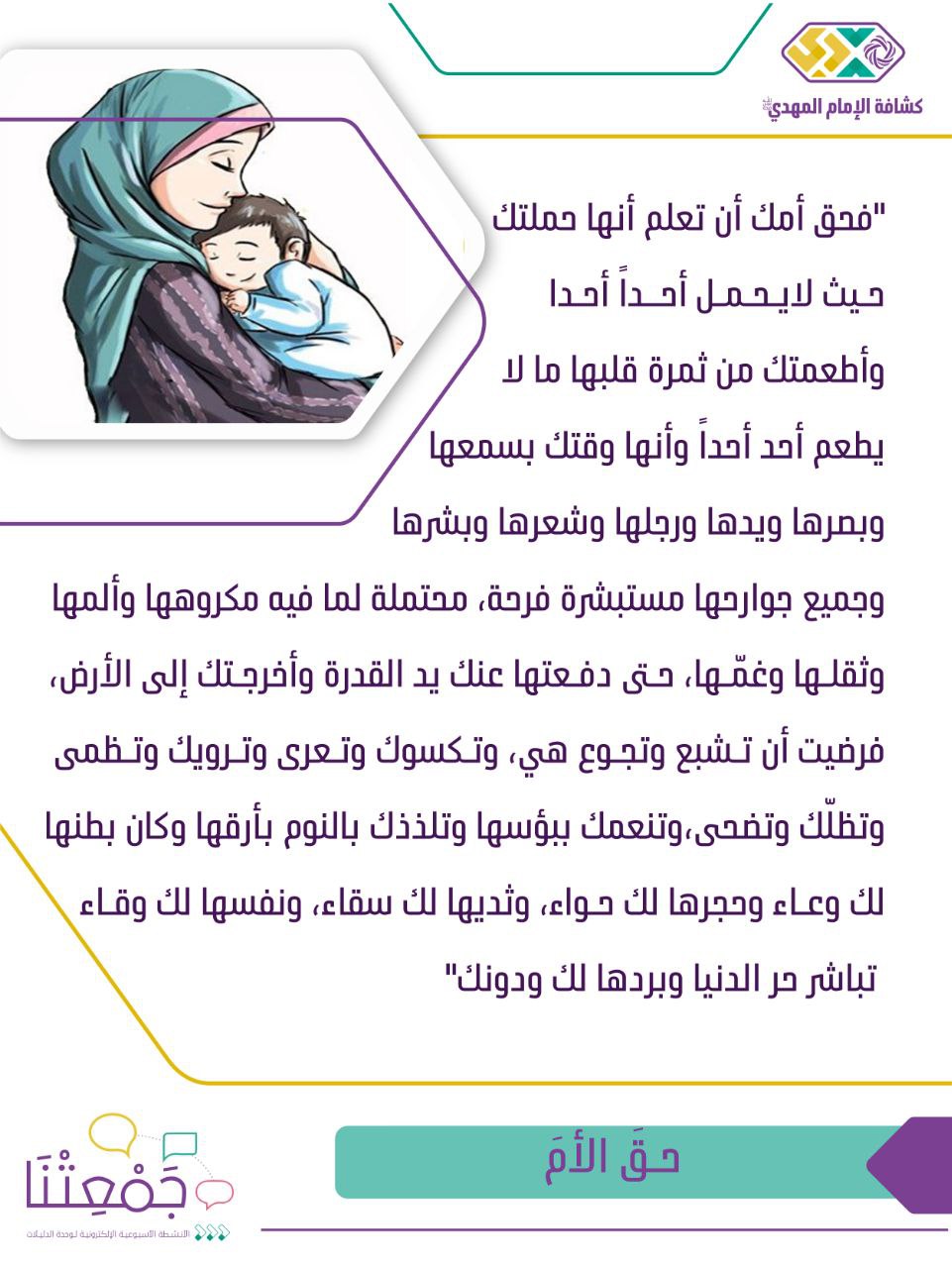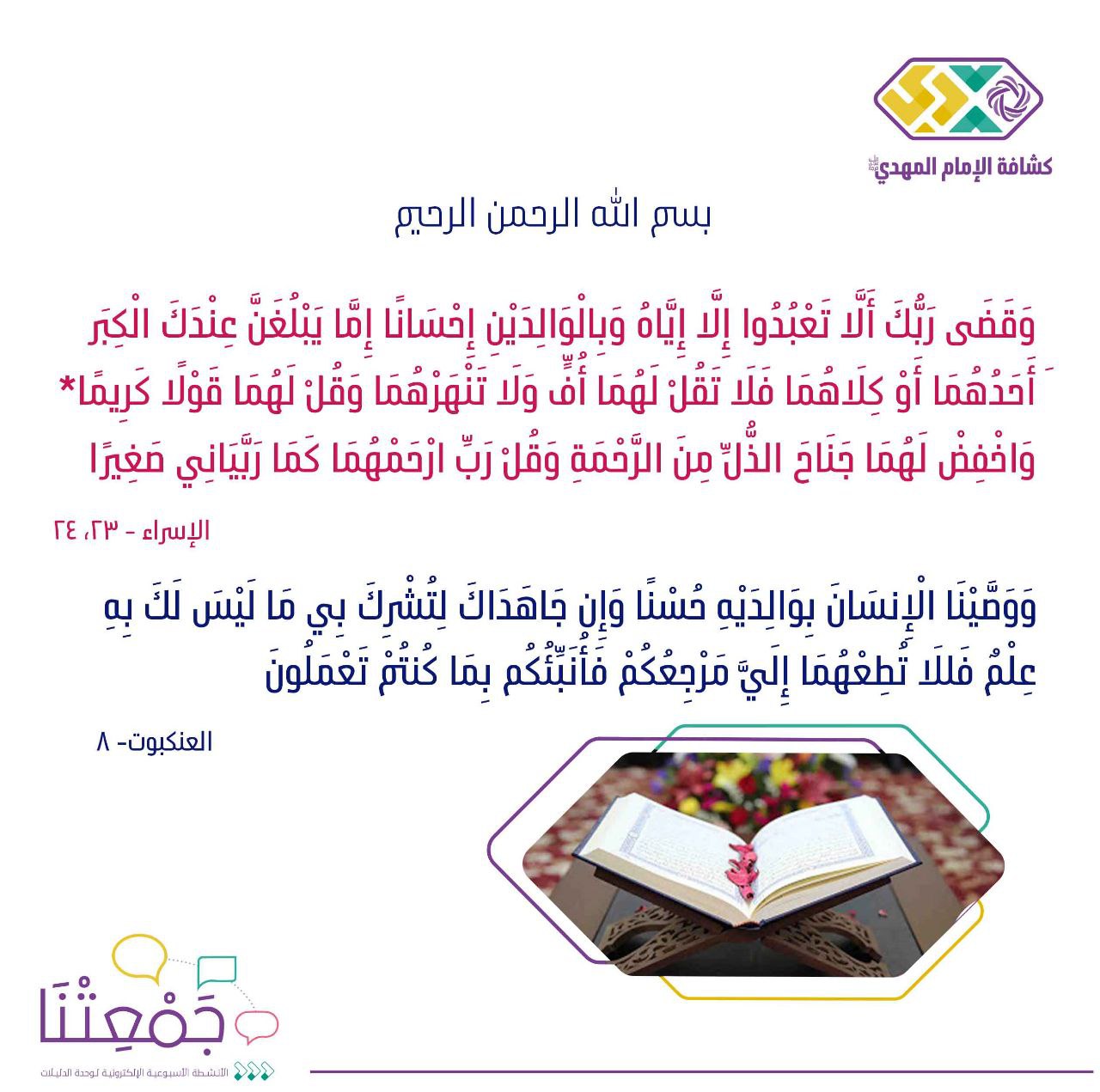 | افتتاح النشاط | آيات قرآنية مباركة وحديث مهدوي ، والسلام على قائم آل محمد عجل الله فرجه | 3د | الآيات والحديث المهدوي بصوت دليلة | يرسل حق الأم أو الأب بوستات لكل دليلة |