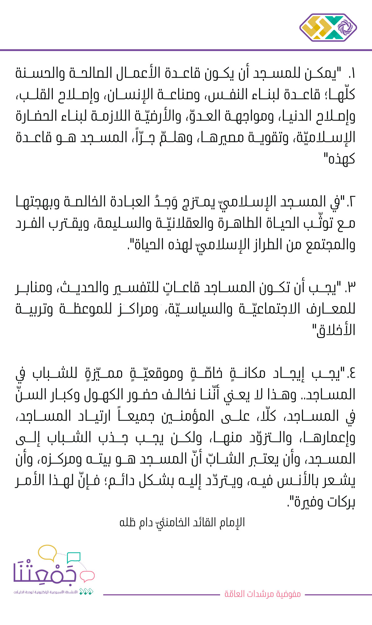 المسجد في كلام الإمام الخمينيّ العظيم قدس سره: وسنذكر ما أشار له مفجّر الثورة الإسلاميّة الإمام آية الله العظمى روح الله الموسويّ الخمينيّ قدس سره من كلمات خالدة في هذا المجال: "لا تهجروا المساجد فإنّ ذلك هو تكليفكم".