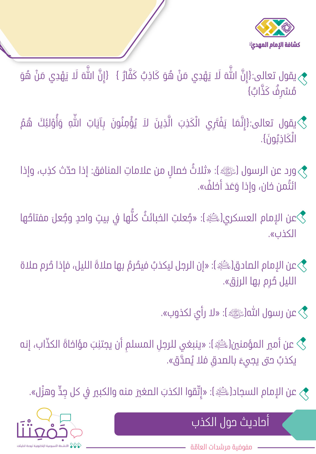 الكذب مفتاح الخبائث: عن الإمام العسكري(عليه السلام): "جُعلتِ الخبائثُ كلُّها في بيتٍ واحدٍ وجُعلَ مفتاحُها الكذب".