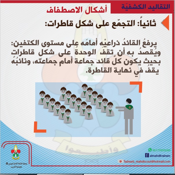 يرفعُ القائدُ ذراعيْه أمامَه على مستوى الكتفين: ويُقصدُ به أن تقفَ الوحدةُ على شكلِ قاطراتٍ بحيث يكون كلُّ قائد جماعة أمام جماعته، ونائبُه يقفُ في نهاية القاطرة.