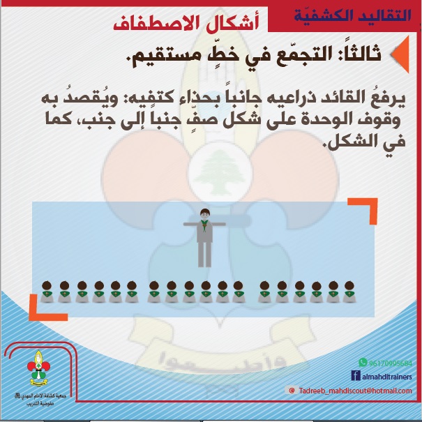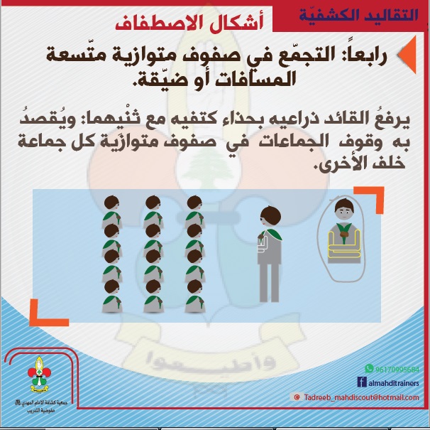 يرفعُ القائد ذراعيه بحذاء كتفيه مع ثنْيِهما: ويُقصدُ به وقوف الجماعات في صفوف متوازية كل جماعة خلف الأخرى.