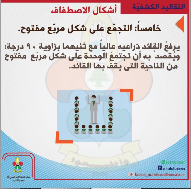 يرفعُ القائد ذراعيه عالياً مع ثنيهما بزاوية 90 درجة: ويُقصدُ به أن تجتمعَ الوحدة على شكل مربّع مفتوح من الناحية التى يقفُ بها القائد.