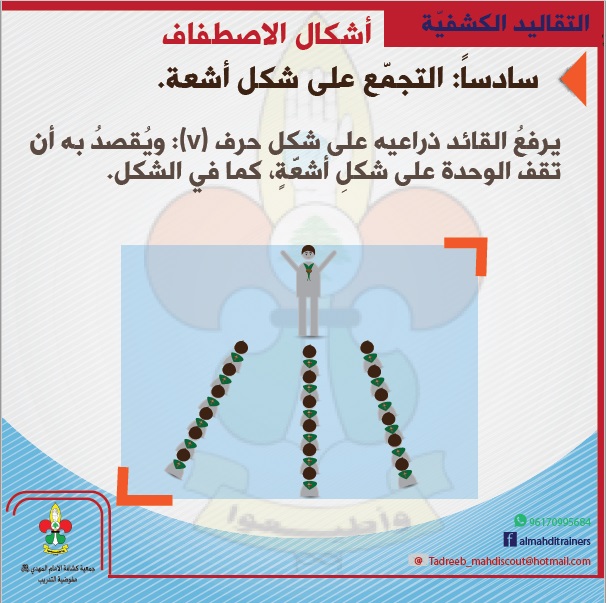 يرفعُ القائد ذراعيه على شكل حرف (v) أو رقم (7) : ويُقصدُ به أن تقف الوحدة على شكلِ أشعَّةٍ، كما في الشكل.