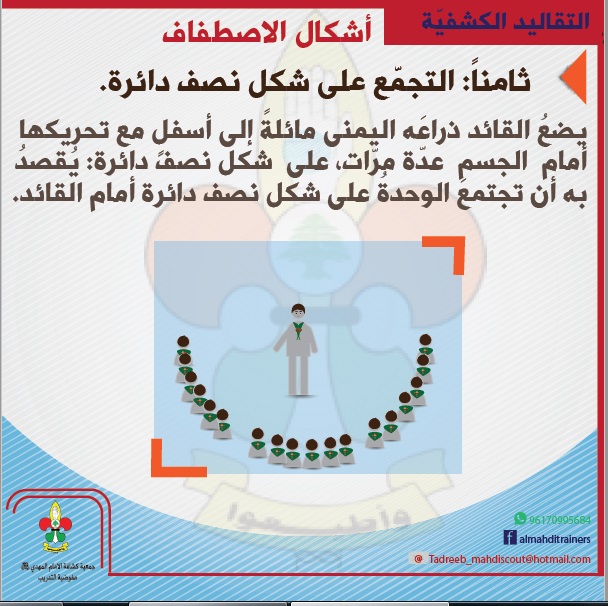 يضعُ القائد ذراعَه اليمنى مائلةً إلى أسفلٍ مع تحريكها أمام الجسم عدّة مرّات، على شكل نصف دائرة: يُقصدُ به أن تجتمعَ الوحدةُ على شكل نصف دائرة أمام القائد.
