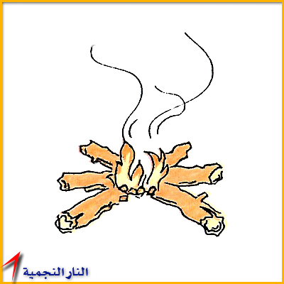 2. نار التخييم (أو النار النجمية) : وهي أجود أنواع النيران لأن لهبها قوي ودخانها قليل فضلاً على أنها لا تنطفئ بسهولة وتستعمل لتوفير الوقود والتدفئة ليلاً وطريقة عملها أن تضع ثلاث قطع من الخشب على الأرض على شكل نجمة مع ملاحظة أن أطراف الحطب أو الخشب تكون مجتمعة على الشكل التالي :
