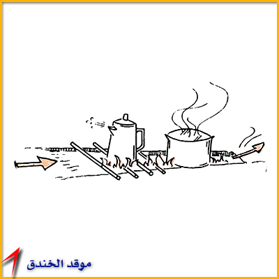 3. نار الخندق: وتستعمل هذه النار للمحافظة على الحرارة والوقود وتستعمل في طهو عدة أصناف من الطعام وطريقة عملها هي أن تحضر خنقاً في اتجاه الريح بحيث يكون عرضه من جهة مهب الريح ضعف مسطح قاع الأواني المستخدمة في الطبخ ثم تضيف المسافة بالتدريج حتى تصبح كافيه لحمل هذه الأواني ويكون عمق الحفرة 30 سم على الأقل ويمكن تبطين الجدران بقوالب الطوب.