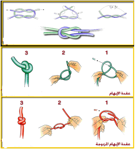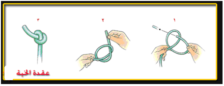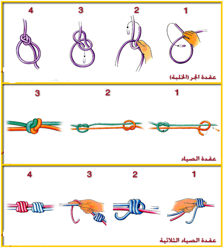 العقدة:تستخدم لربط حبل بآخر، أو بنفسه مثل (الأفقية، التقصيرية، التوصيلية، المطافي، السماك، الخلبة، الجر).