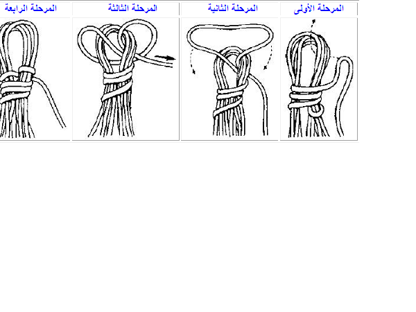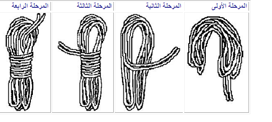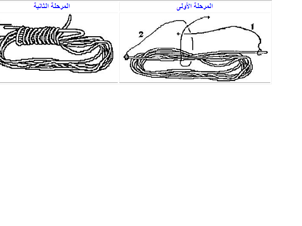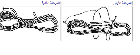 • جمع الحبال الطويلة: يثنى الحبل ثنية واحدة ليصبح على شكل حبلان متوازيان وتطبّق الطّريقة المبينة في الجدول, لتسهيل حمله أو ربطه.