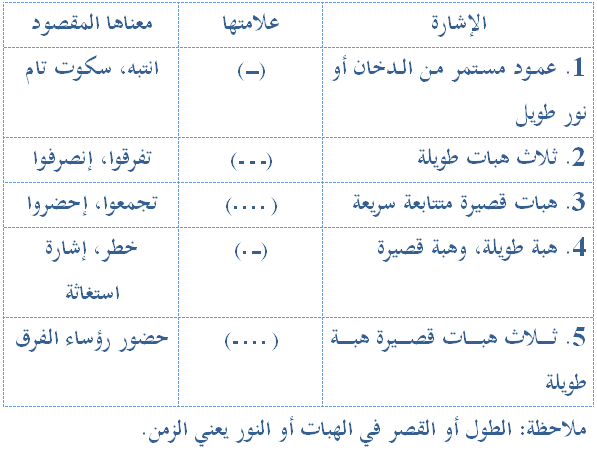 يلجأ الكشاف في الليل أو النهار الى استعمال الضوء أو الدخان أو النار كإشارة سرية بين أفراده في ظروف خاصة تمنع من استعمال الصافرة.