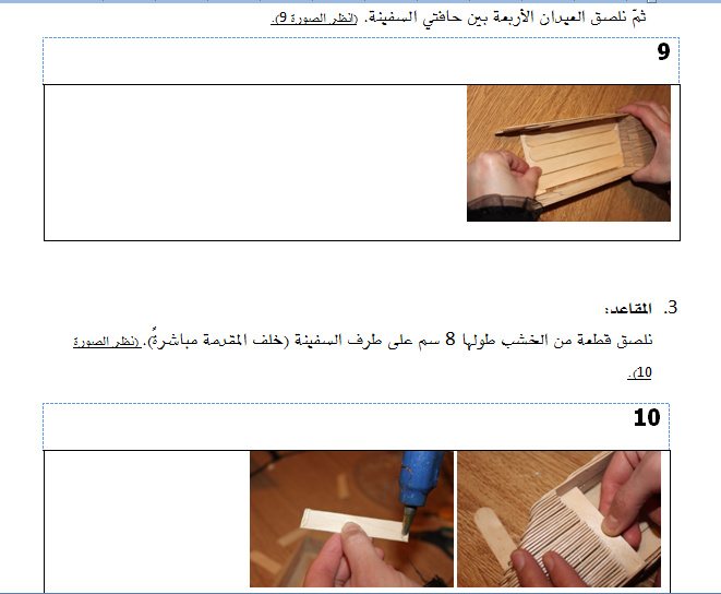 ثمّ نلصق العيدان الأربعة بين حافتي السفينة. (انظر الصورة 9).