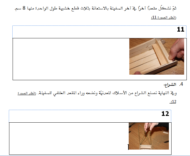 ثمّ نشكّل مقعدًا آخرًا في آخر السفينة بالاستعانة بثلاث قطع خشبية طول الواحدة منها 8 سم. (انظر الصورة 11)