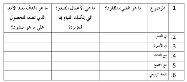 بعد أن تنجح في المجال الأول إبدأ بتعميم تجربتك على باقي المجالات والجوانب في حياتك (العمل، الأسرة، الذات، المجتمع والبعد الروحي).
