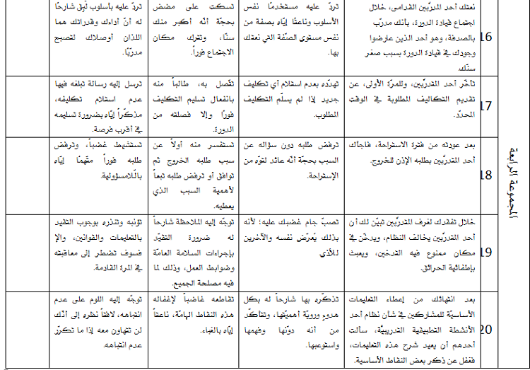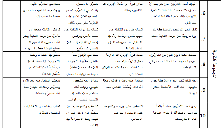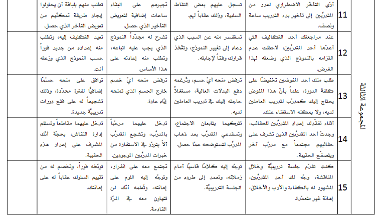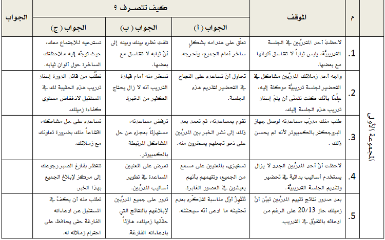 أمامك مجموعة من المواقف العملية التي يمكن أن تحدث معك في أيّ لحظة خلال مشاركتك في التدريب، وقد لا تحدث. عليك أن تفترض نفسك داخل هذا الموقف وتُقدّر ما هي ردّة فعلك الأولية عليه، كما أنت الآن لا كما ينبغي أن تكون.