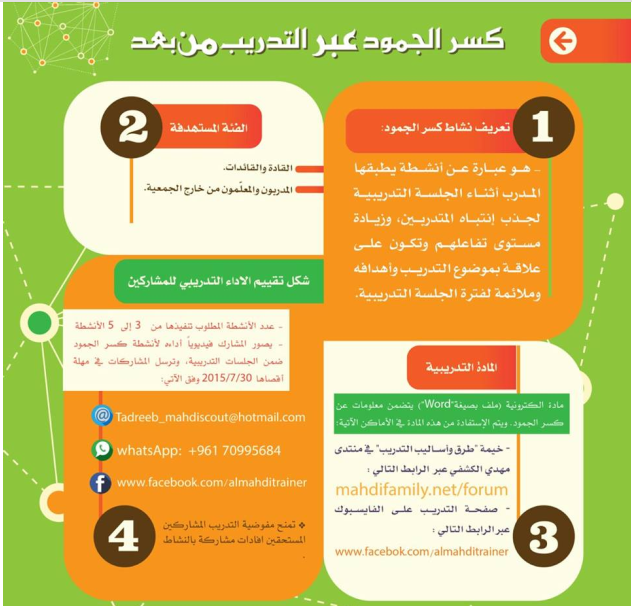 أيها القائد(ة) أيها المدرب(ة) شارك في تنفيذ أنشطة أثناء الجلسة التدريبية لجذب إنتباه المتدربين، وزيادة مستوى تفاعلهم وتكون على علاقة بموضوع التدريب وأهدافه.