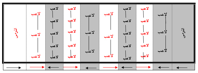 المسافة بين كل خط من اللاعبين والخط الآخر هو ثلاثة أمتار أو متران ونصف.