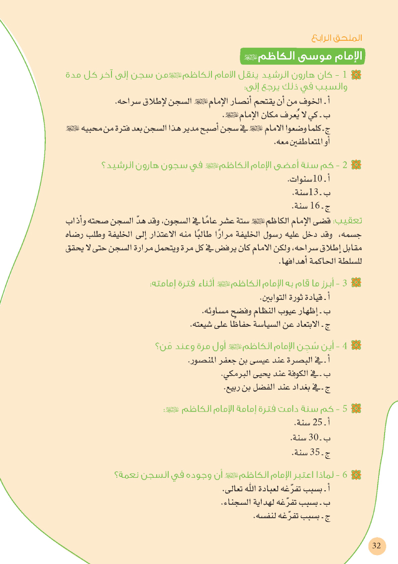 2. مسابقة كاظم الغيظ (عليه السلام)--- 50 د. --- كما ورد في مضمون الفقرة. --- الملحق (وارد أدناه)، طاولات وكراسي، أوراق وأقلام حبر.