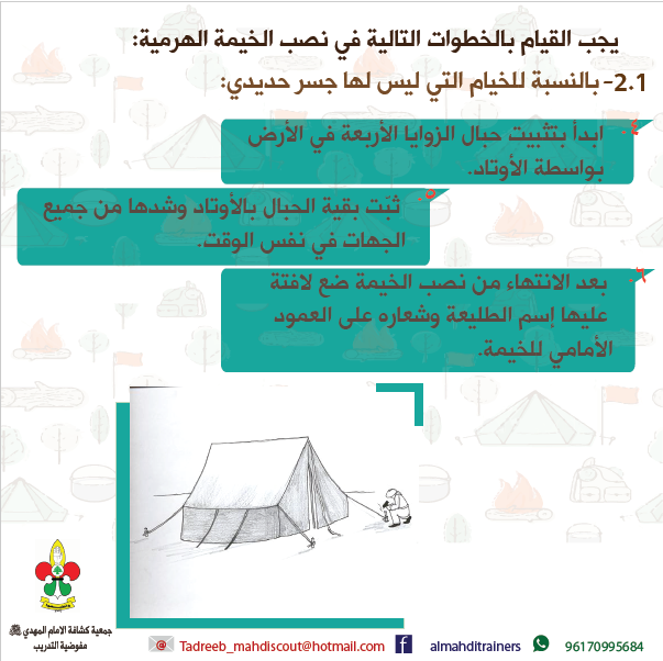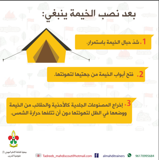 - يجب أن يتساوى شدّ الحبال من جميع الجهات حتّى لا تكون الخيمة مائلةً.
