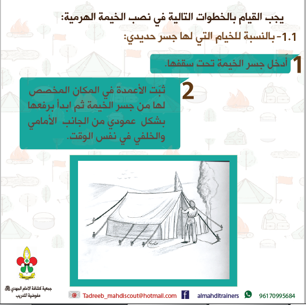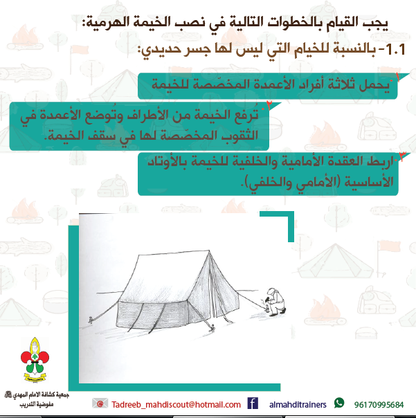 7. بعد الانتهاء من نصب الخيمة ضع لافتةً عليها إسم الرهط وشعاره على العامود الأماميّ للخيمة.
