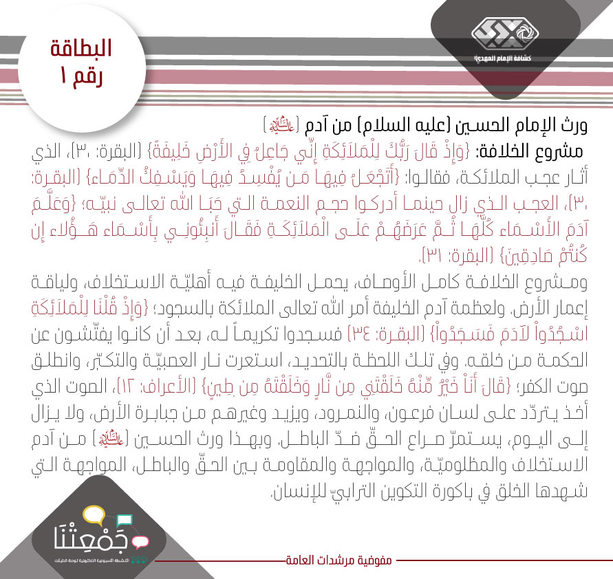 الاستخلاف والمظلوميّة، والمواجهة والمقاومة بين الحقّ والباطل، المواجهة التي شهدها الخلق في باكورة التكوين الترابيّ للإنسان |