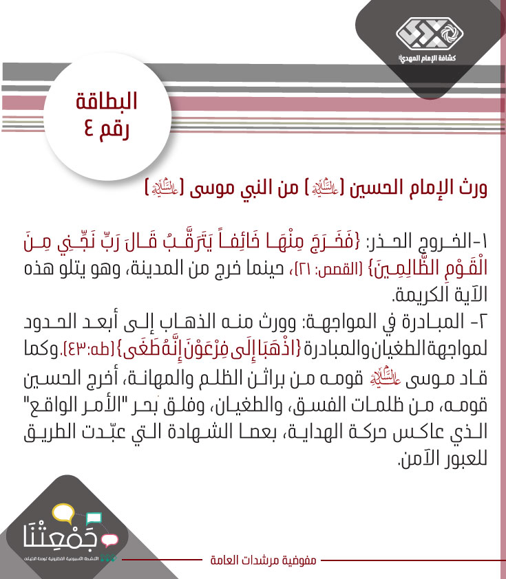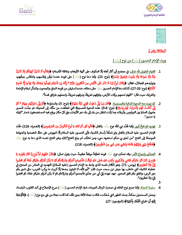 لماذا كان الحسين (عليه السلام) وارثاً للانبياء ( آدم، نوح، إبراهيم موسى عيسى محمد (صلّى الله عليه وآله)؟ توزع القائدة البطاقات على الأرهاط وتعطي وقت محدد لملأ الجدول الذي يتضمن أسماء الأنبياء بجهة والموقف المشابه للحسين في الجهة المقابلة وعند الإنتهاء يقدم كل رهط ما توصل إليه .وتختتم الفقرة بلطمية حسينية |