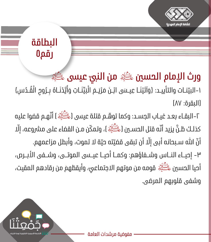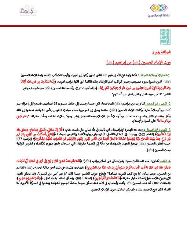 | "شُغلنا عن الجنة بالنظر إلى الحسين" | ترسل القائدة قبل النشاط مقطع فيديو للشيخ بشير النجفي الذي يشرح فيه معنى الآية (وسيق الذين اتقوا ربهم ...) وتطلب من كل دليلة كتابة انطباعها على ورقة جانباً تحتفظ بها أو مباشرة . | 10د | مقطع فيديو 7:50د | تضع الدليلة الإنطباع 1على ورقة جانبية |