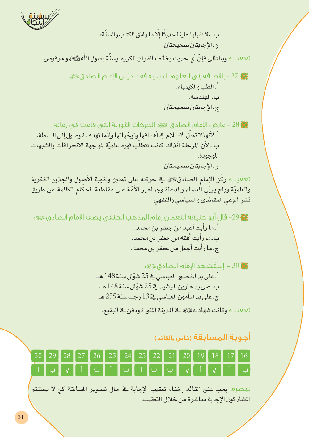 - يسأل القائد عن أبرز المعلومات التي يمتلكها المشاركون عن الإمام الصادق عليه السلام، بحيث يقدّم كل مشارك معلومة واحدة.