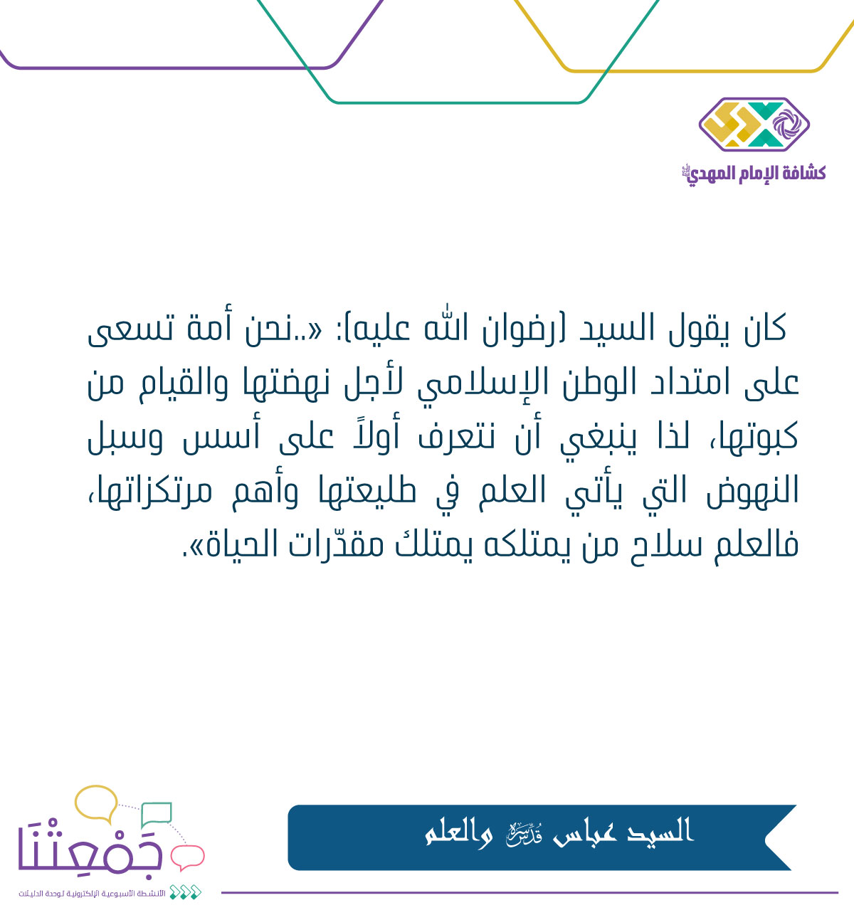 بطاقة العلم: كان يقول السيد (رضوان الله عليه): "..نحن أمة تسعى على امتداد الوطن الإسلامي لأجل نهضتها والقيام من كبوتها، لذا ينبغي أن نتعرف أولًا على أسس وسبُل النهوض التي يأتي العلم في طليعتها وأهم مرتكزاتها، فالعلم سلاح من يمتلكه يمتلك مقدّرات الحياة"..