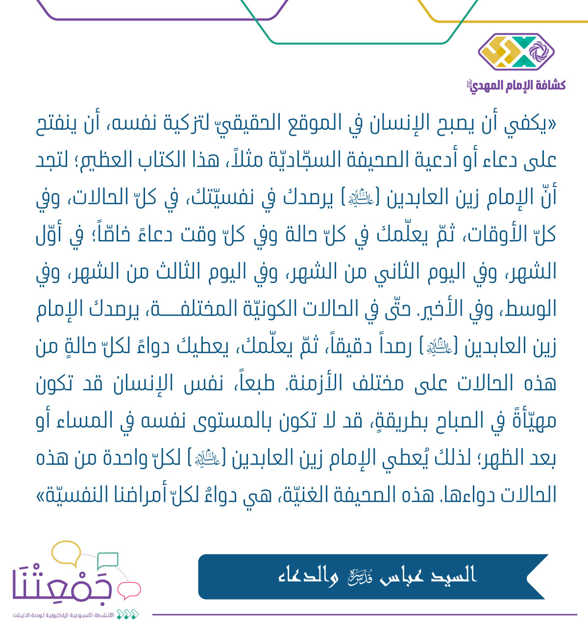 " يكفي أن يصبح الإنسان في الموقع الحقيقيّ لتزكية نفسه، أن ينفتح على دعاء أو أدعية الصحيفة السجّاديّة مثلاً، هذا الكتاب العظيم؛ لتجد أنّ الإمام زين العابدين (عليه السلام) يرصدك في نفسيّتك، في كلّ الحالات، وفي كلّ الأوقات، ثمّ يعلّمك في كلّ حالة وفي كلّ وقت دعاءً خاصّاً؛ في أوّل الشهر، وفي اليوم الثاني من الشهر، وفي اليوم الثالث من الشهر، وفي الوسط، وفي الأخير. حتّى في الحالات الكونيّة المختلفــــة، يرصدك الإمام زين العابدين (عليه السلام) رصداً دقيقاً، ثمّ يعلّمك، يعطيك دواءً لكلّ حالةٍ من هذه الحالات على مختلف الأزمنة. طبعاً، نفس الإنسان قد تكون مهيّأةً في الصباح بطريقةٍ، قد لا تكون بالمستوى نفسه في المساء أو بعد الظهر؛ لذلك يُعطي الإمام زين العابدين (عليه السلام) لكلّ واحدة من هذه الحالات دواءها. هذه الصحيفة الغنيّة، هي دواءٌ لكلّ أمراضنا النفسيّة. وهذه الكتب الثمينة التي تشكّل رصيدًا معنويًّا هائلًا لتهذيب أنفسنا، هي البوّابة الكاملة على الحياة بكلّ معانيها، تستطيع أن تلج إليها من هذه البوّابات.