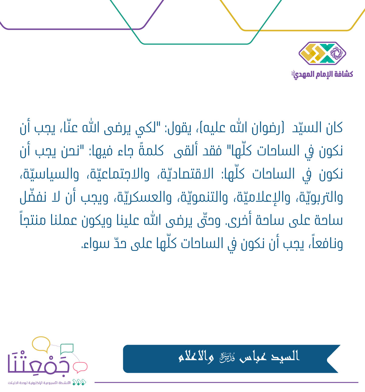 العلم والاعلام: كان السيّد (رضوان الله عليه)، يقول: "لكي يرضى الله عنّا، يجب أن نكون في الساحات كلّها" فقد ألقى كلمةً جاء فيها: "نحن يجب أن نكون في الساحات كلّها: الاقتصاديّة، والاجتماعيّة، والسياسيّة، والتربويّة، والإعلاميّة، والتنمويّة، والعسكريّة، ويجب أن لا نفضّل ساحة على ساحة أخرى. وحتّى يرضى الله علينا ويكون عملنا منتجًا ونافعًا، يجب أن نكون في الساحات كلّها على حدّ سواء".