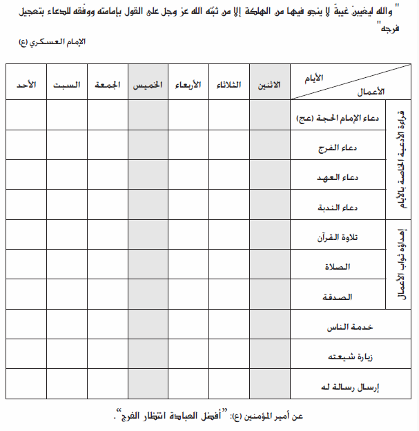يوزع القائد على كلّ طليعة كرتونة وقلماً عريضاً، لتعدّ جدولاً بالأعمال التي تعجّل ظهور الإمام الحجة (عج)، وبعد الانتهاء من مرحلة الاعداد يقوم الناطق باسم كل طليعة لعرض الجدول الذي أعدّته الطليعة.