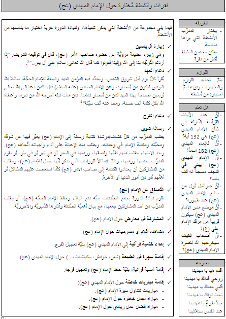 نضع بين أيديكم مجموعة من أفكار الأنشطة التي تتمحور حول الإمام المهدي (عجل الله تعالى فرجه) من ضمن إصدار دورات قادة الجماعات.