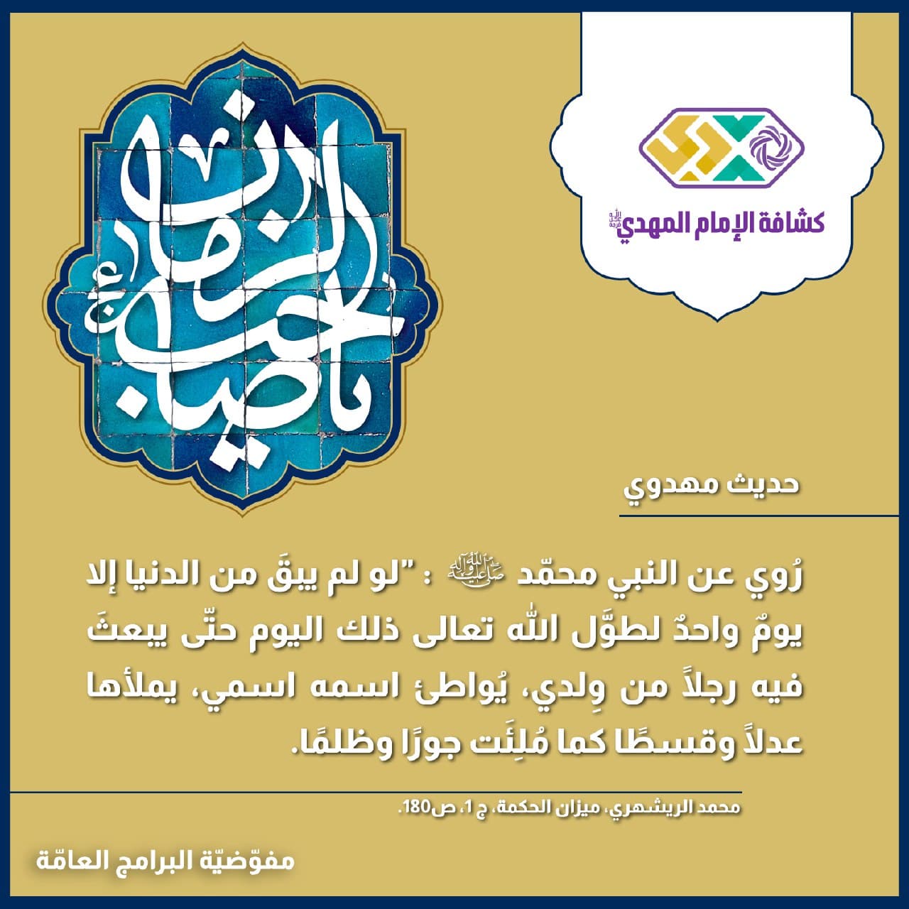 رُوي عن النبي محمّد صلّى الله عليه وآله: "لو لم يبقَ من الدنيا إلا يومٌ واحدٌ لطوَّل الله تعالى ذلك اليوم حتّى يبعثَ فيه رجلًا من وِلدي، يُواطئ اسمه اسمي، يملأها عدلًا وقسطًا كما مُلِئَت جورًا وظلمًا. (محمد الريشهري، ميزان الحكمة، ج 1، ص180).