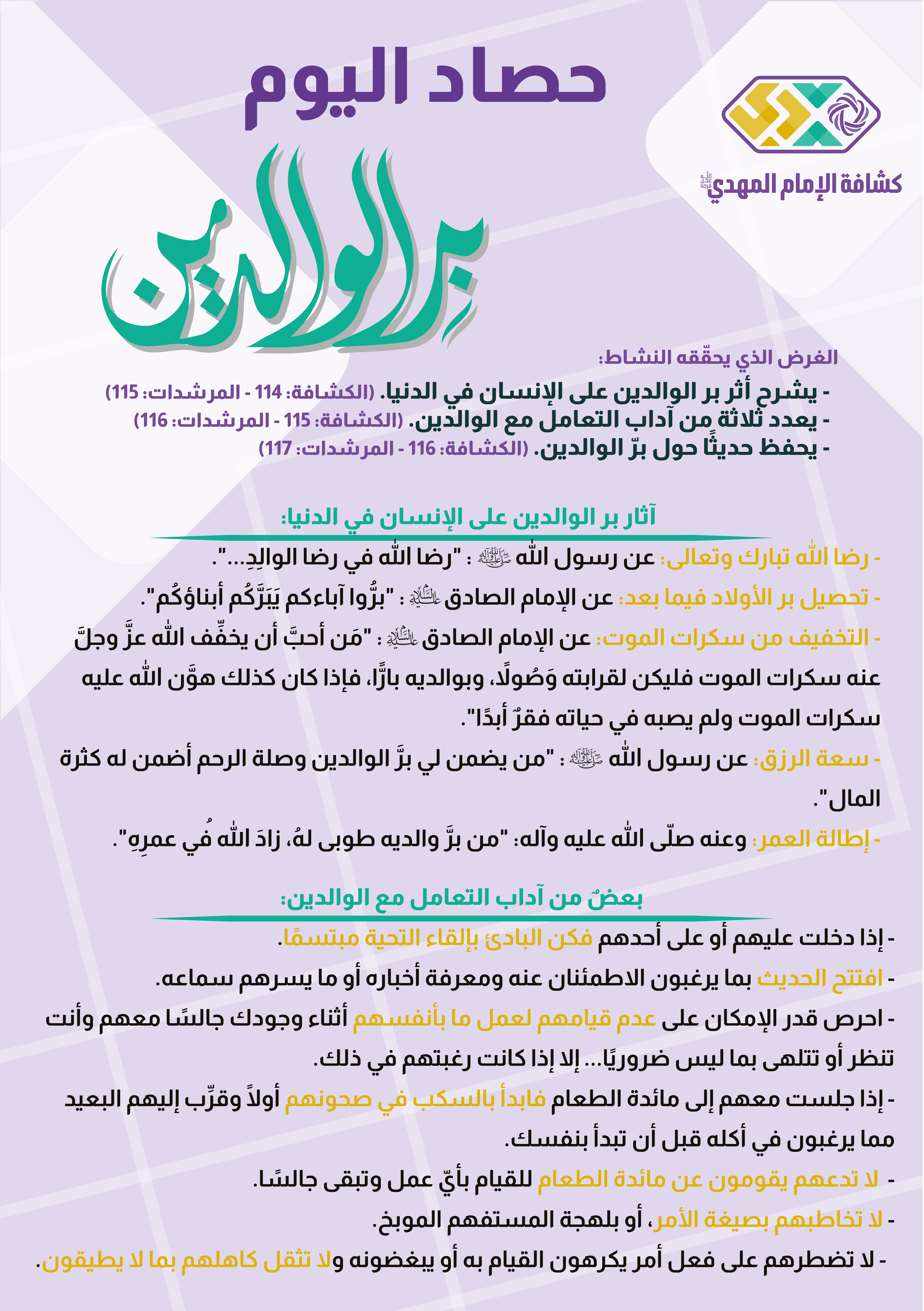 - يحفظ حديثًا حول برّ الوالدين. (الكشافة: 116 / المرشدات: 117)