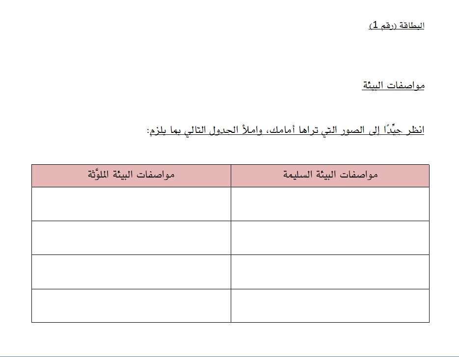 - يطلب من كلّ مجموعةٍ (من خلال الصور) ملء البطاقة بمواصفات البيئتين.