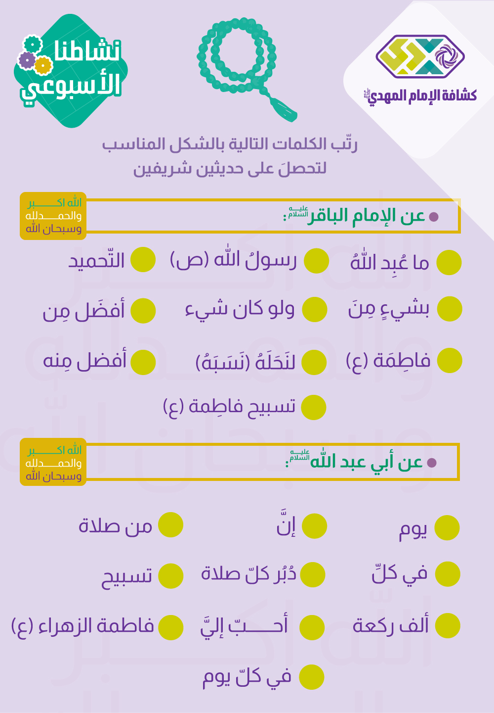 - يرسل القائد/ة بطاقة النشاط المرفقة حول أحاديث في ثواب وفضل تسبيحة الزهراء (عليها السلام) ويطلب من الأفراد حل البطاقة وإرسالها الى القائد.
