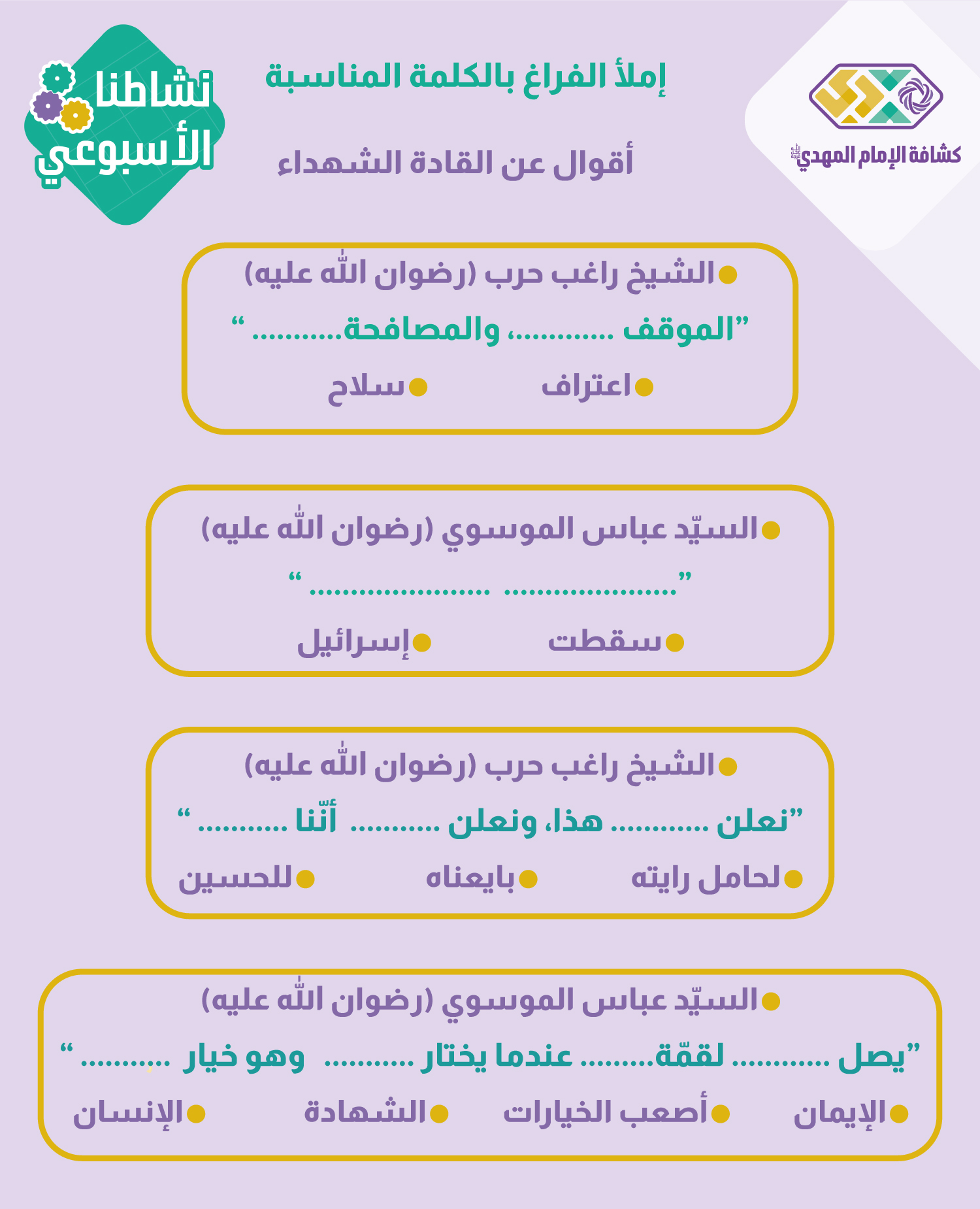 - يعقّب القائد: "ومن الشهداء من هم قادة" ثمّ يطلب القائد من كلّ مشارك التعريف عن الشهيد القائد الذي تمّ جمع معلومات حوله.