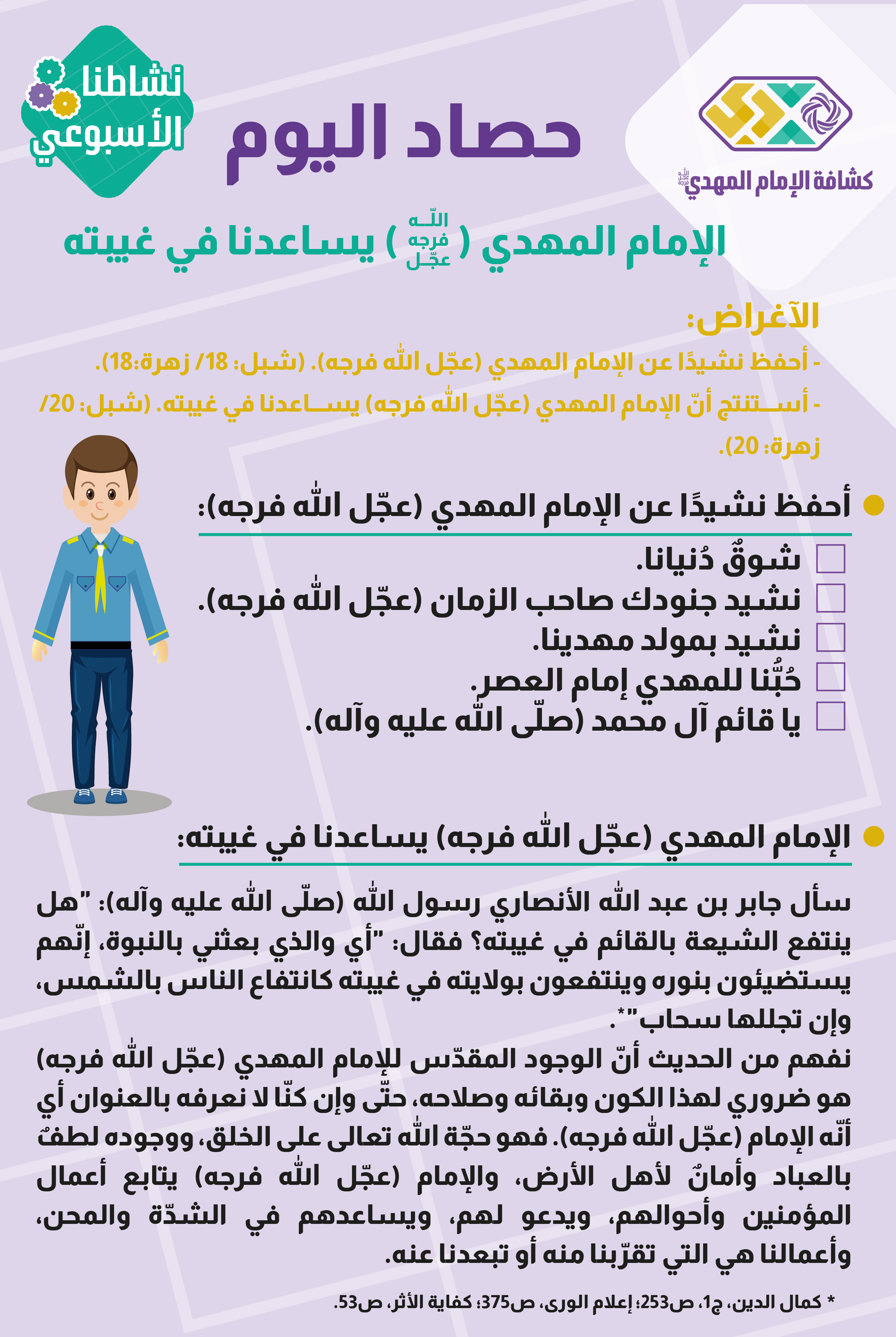 - أستنتج أنّ الإمام المهدي (عجّل الله فرجه) يساعدنا في غيبته. (شبل: 20/ زهرة: 20).