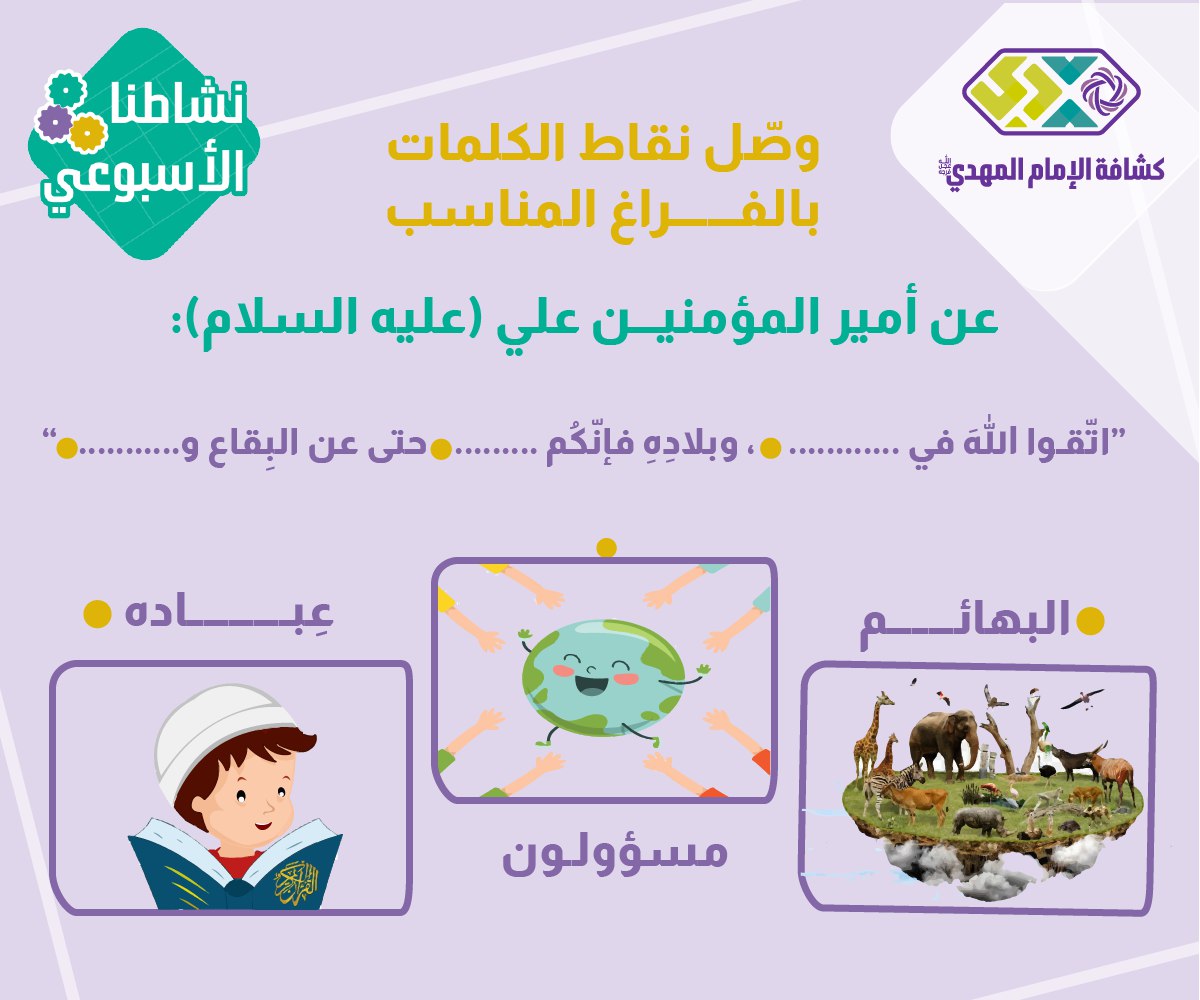 نظيفة أم ملوّثة (15 دقيقة): - يتوجّه القائد/ة بالكلام إلى البراعم (تسجيل صوتي): "البيئة أمانة بين أيدينا يجب أن نحافظ عليها ونهتم بها ونحقق ذلك عندما نقوم بزراعة الأشجار التي تنقّي الهواء؛ البيئة أمانة بين أيدينا علينا أن نسلّم هذه الأمانة إلى صاحب الزّمان (عجّل الله فرجه) وهي بحالة جيّدة.