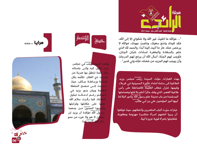 لمزيد من التّفاصيل حول مواقف السّيدة زينب مراجعة أو تصفح صفحة مرايا من مجلة الرائدة العدد 12