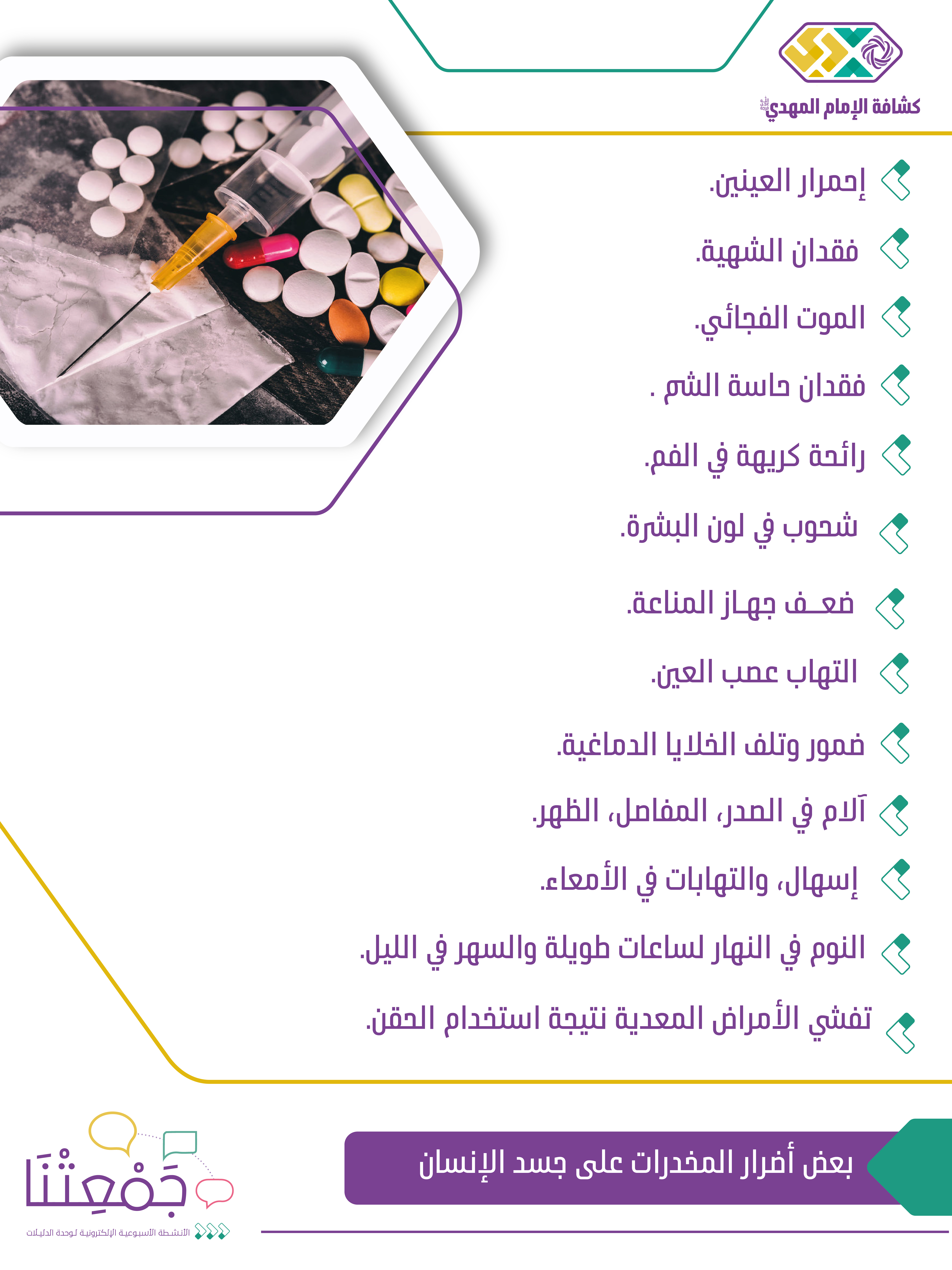 نشاطنا اليوم تحت عنوان المخدرات بداية النهاية، هذه الآفة التي تترك آثارًا مدمرة على جسم وعقل الإنسان، دعونا نتعرف معًا على بعض من هذه الآثار.