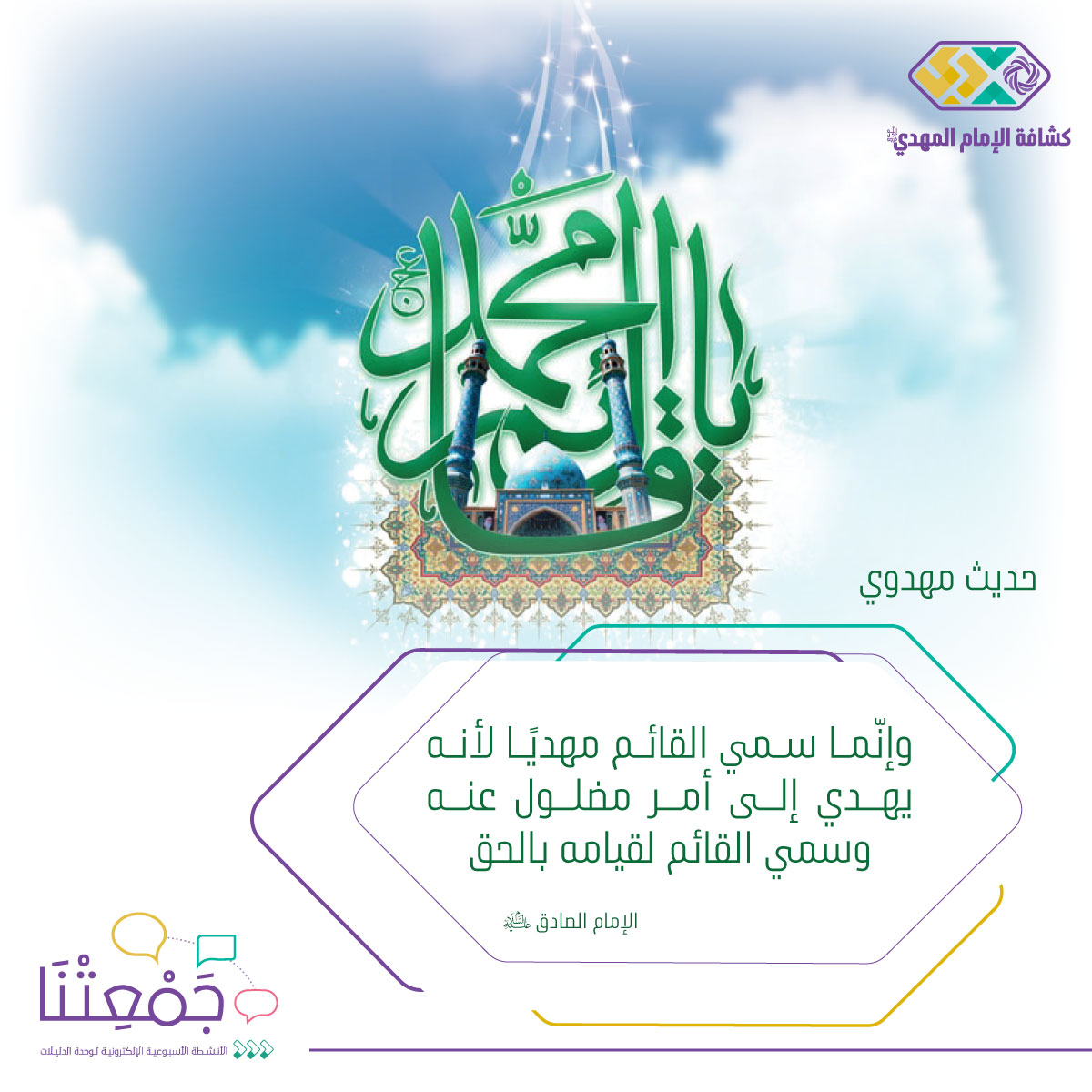 -حديث مهدوي:عن الإمام الصادق عليه السلام: "إنّما سمّي القائم مهديًّا لأنه يهدي إلى أمر مضلول عنه، وسمي القائم لقيامه بالحق".