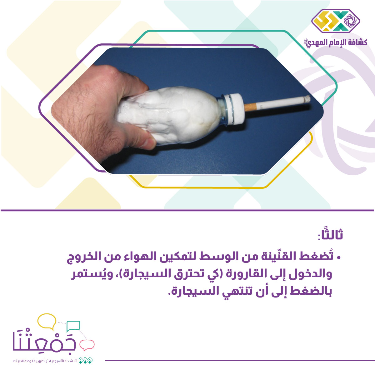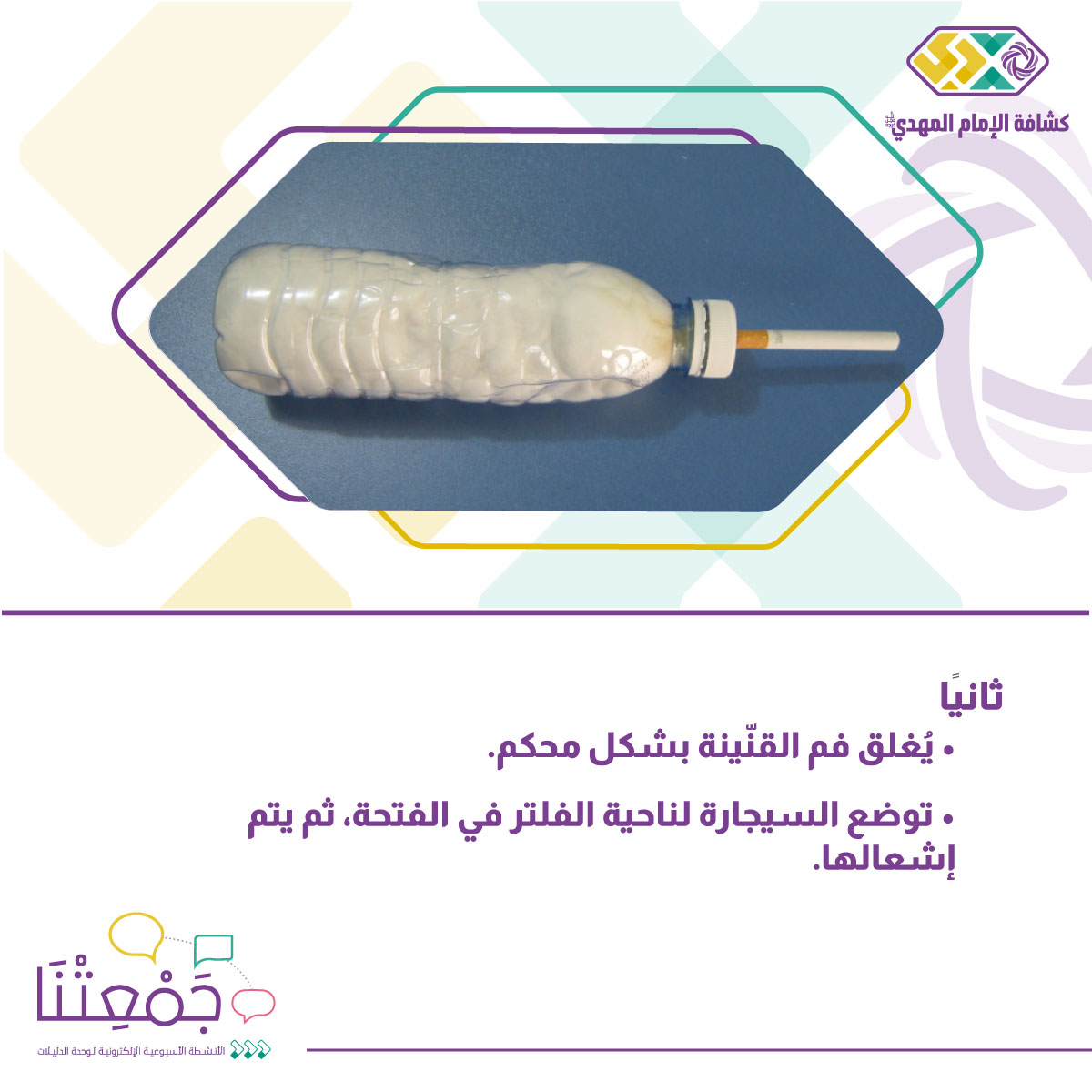 التجربة: قنينة مياه فارغة، قطن، 5 سيجارات)، أو بوستات التجربة