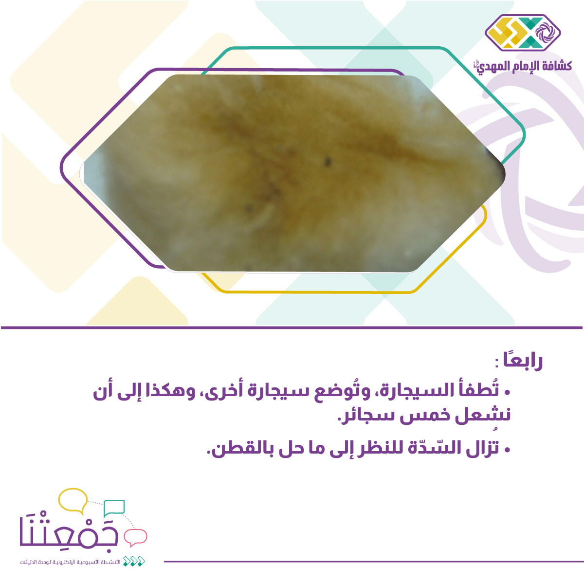 • ترسل القائدة فيديو الدكتورة التي تتحدث عن مضار التدخين والنرجيلة. (يمكن استبدال الفيديو باستضافة دكتورة عبر الزووم للحديث عن الأمر).
