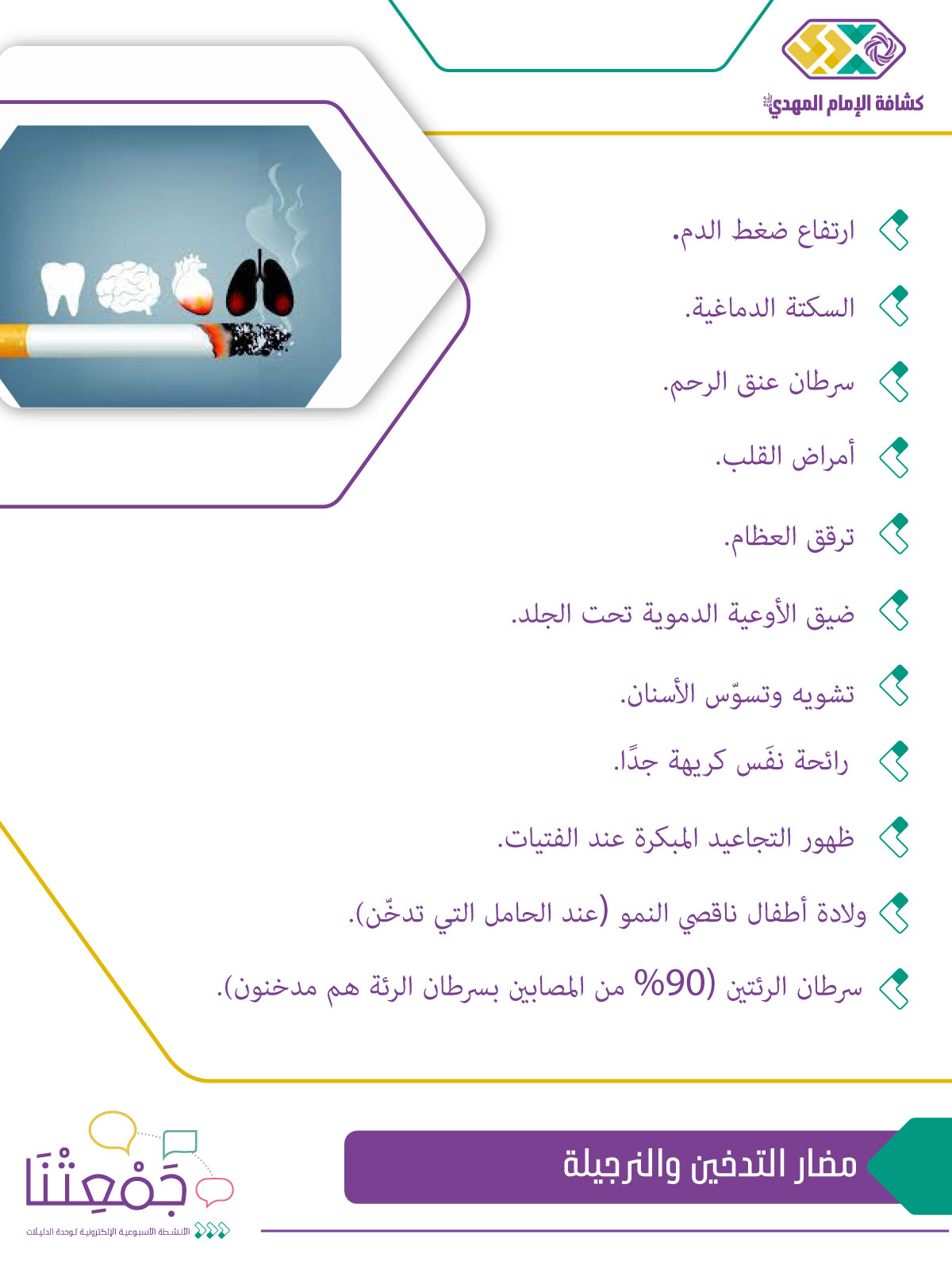 • تسأل القائدة: من منكن تعرّف ماذا يحدث بأعضاء الجسم عندما نشرب نرجيلة أو سيجارة؟؟