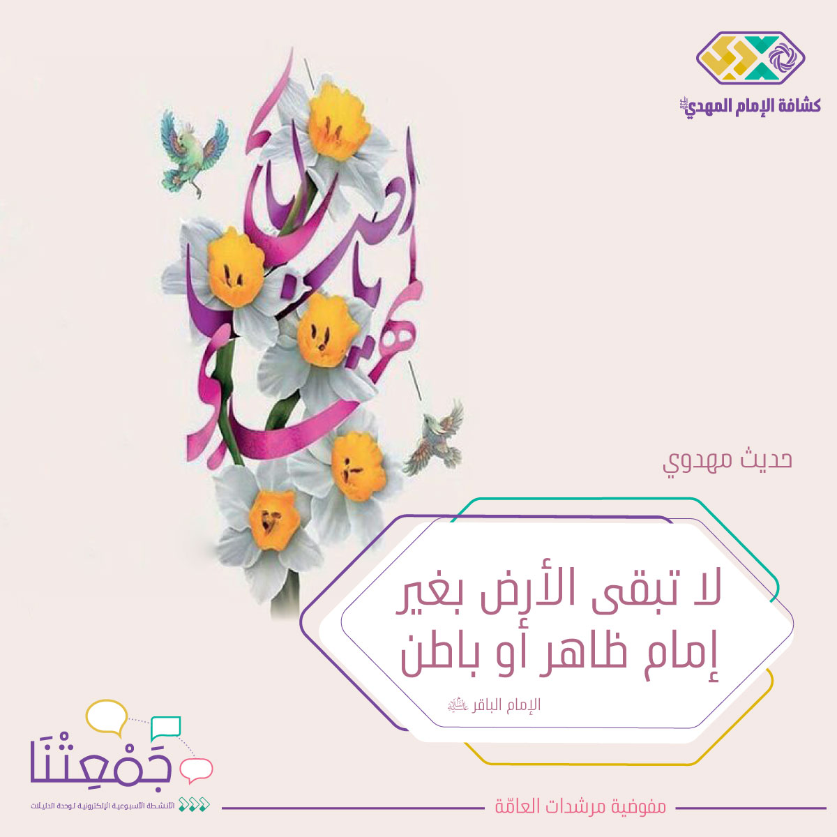 ● حديث مهدوي: عن الإمام الباقر عليه السلام: "لا تبقى الأرض بغير إمام ظاهر أو باطن".